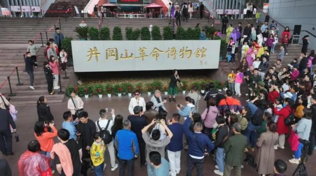 這里是井岡山革命博物館舉辦的紅歌大家唱活動現場,井岡紅謠傳承人陳萍梅正在為游客演唱當地的紅色歌謠,吸引了許多游客駐足觀看,并同唱紅歌,氣氛十分熱烈。